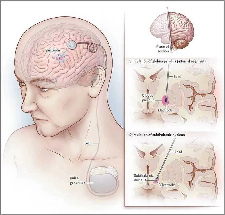 腦深部電刺激(DBS)俗稱“腦起搏器”,是一種先進的神經調控技術,是通過立體定向技術將刺激電極植入深部腦中特定神經核團(如丘腦底核,蒼白球內側核等), 連接這些電極的電線通過耳后及后頸部的皮下隧道連接至埋在鎖骨下胸部的脈沖發(fā)生器中。當這個裝置被開啟時,電流會通過腦內電極對植入的目標區(qū)域發(fā)出高頻的電刺激,以此來抑制神經元的異常電活動,幫助大腦恢復正常的神經信號傳導,從而達到減輕患者運動障礙癥狀、提高生活質量的目的。